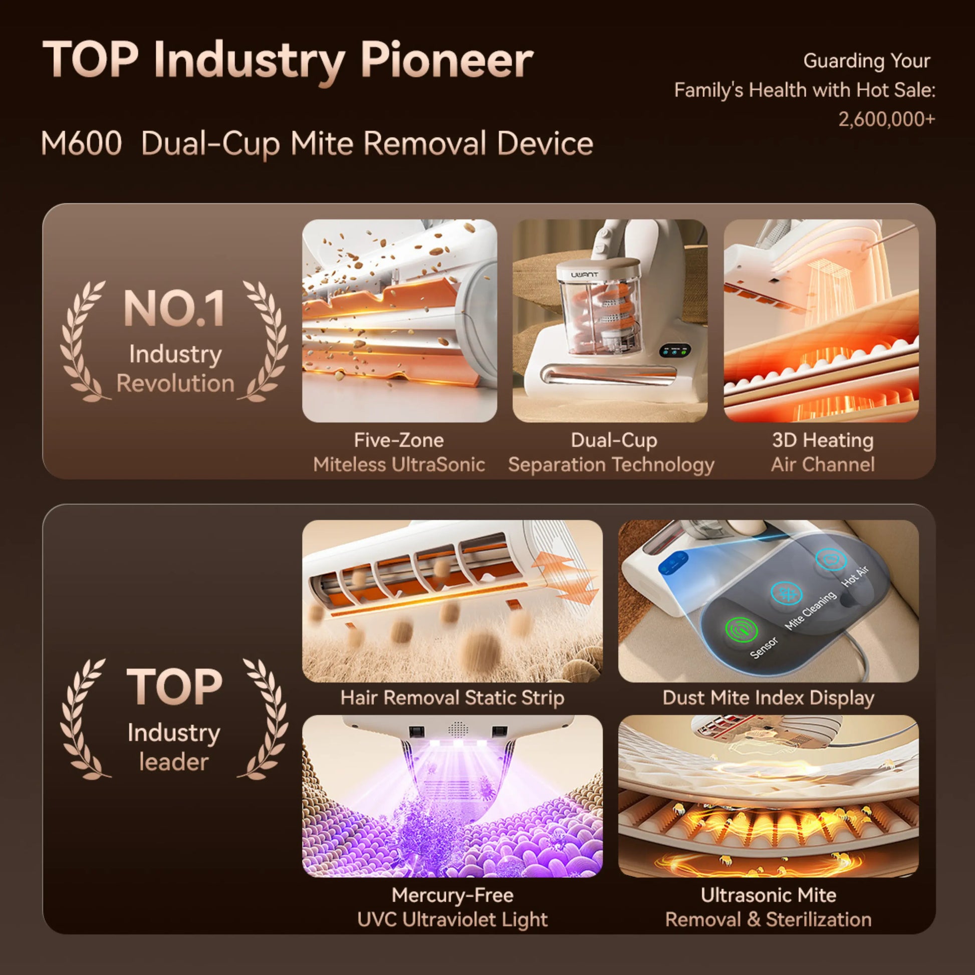 UWANT M600 UV Dust-Mite Vacuum is an upgraded essential cleaning tool for any home, designed to effectively eliminate dust mites and allergens from your bedding, upholstery, and other surfaces. Building upon the success of the M500, this innovative vacuum features enhanced powerful suction, an improved UV sterilization system, and a variety of attachments, making it ideal for creating a healthy and allergy-free environment for you and your family.