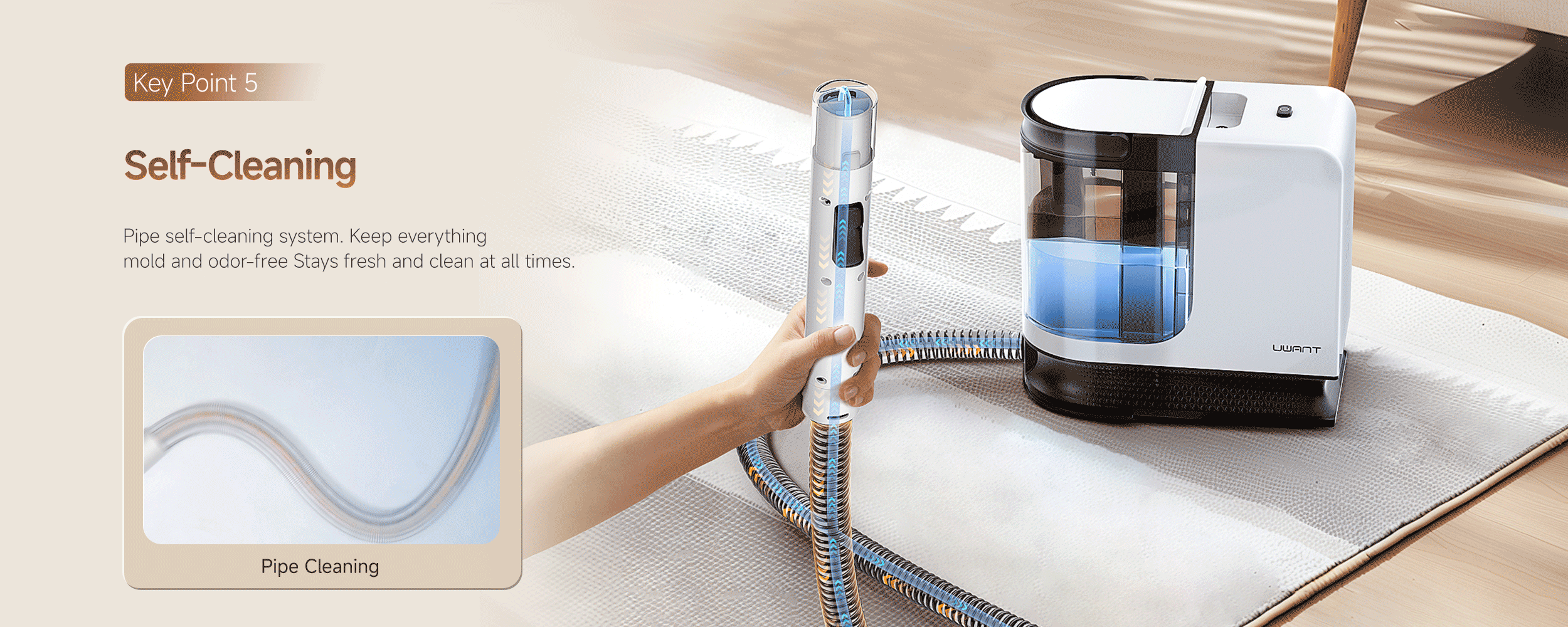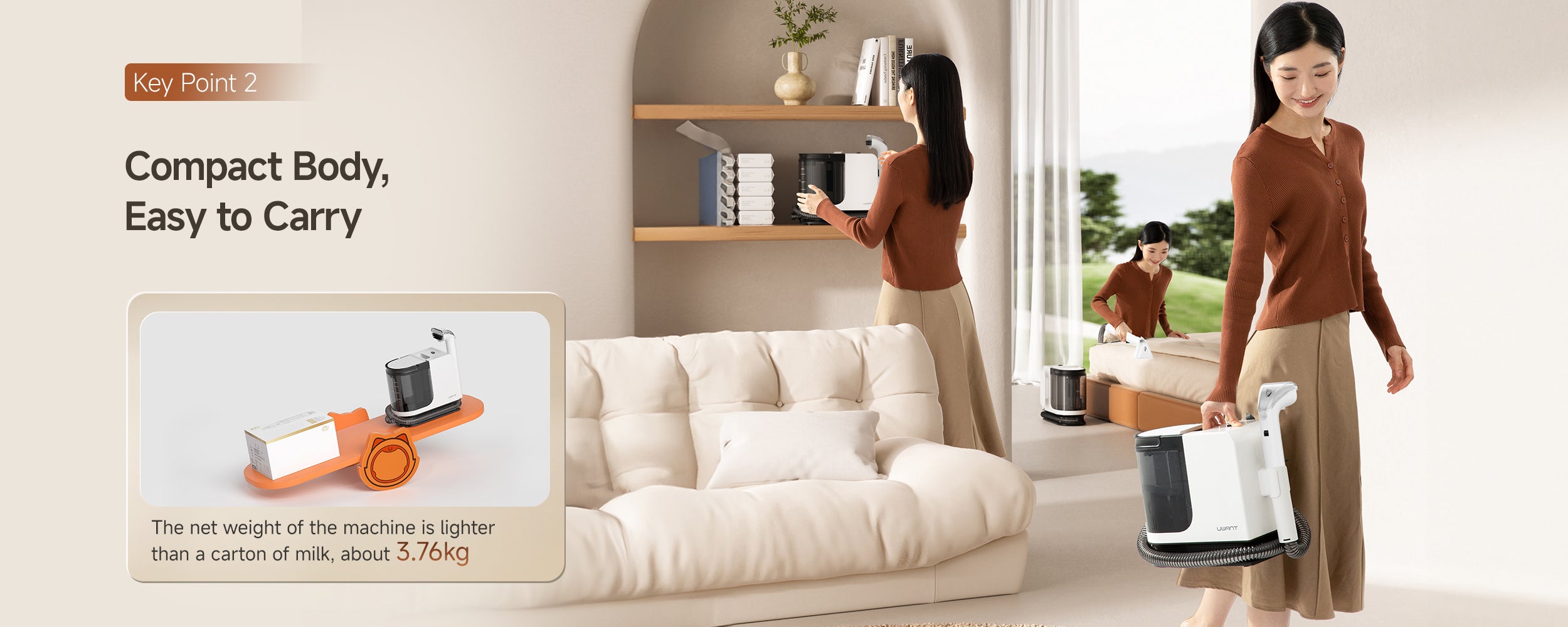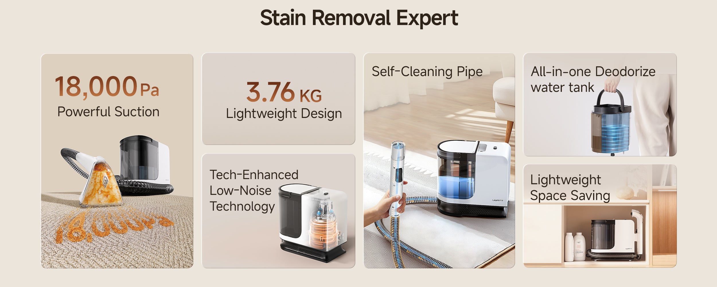The Uwant Y200 is a lightweight yet powerful Spot Cleaner designed for quick, deep, and effortless stain removal. Delivering 18,000Pa strong suction, it lifts embedded dirt from sofas, mattresses, car seats, and upholstery with ease. Its self-cleaning system and integrated clean & dirty water tank simplify maintenance, while the ultra-light 3.76kg body makes it easy to carry and maneuver anywhere. A compact solution for spotless living.